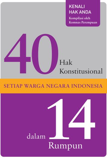 Booklet ini merupakan materi kampanye Komnas Perempuan dan mendiseminasi 40 hak konstitusional kita sebagai warga negara Indonesia. Dengan booklet ini, masyarakat Indonesia mengenal dan paham 40 hak konstitusionalnya, yang menjadi tanggung jawab Negara untuk memberikan pemenuhan kepada warga negaranya. Mari Mengenal 40 Hak Konstitusional kita!