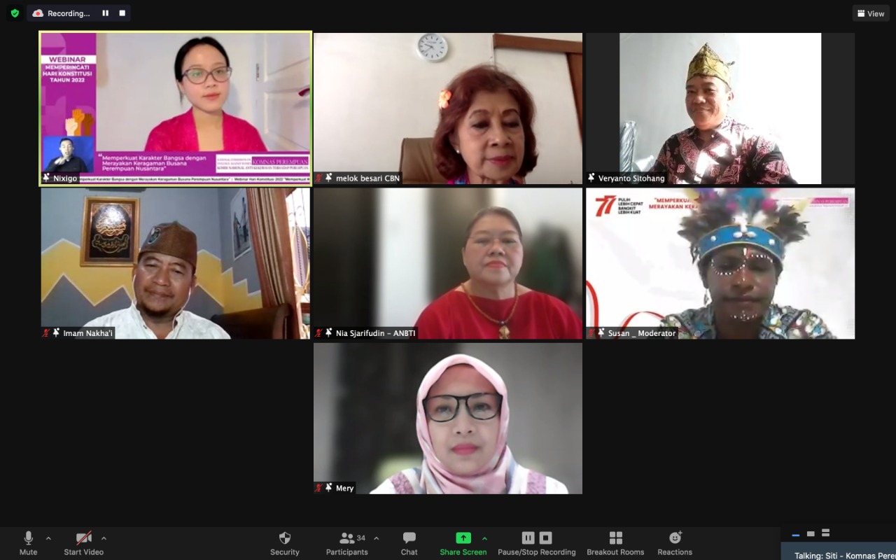 Komisi Nasional Anti Kekerasan Terhadap Perempuan (Komnas Perempuan) memperingati Hari Konstitusi dengan mengadakan webinar bertajuk “Membaca Karakter Bangsa melalui Keberagaman Busana Perempuan Nusantara, Kamis, (18/8/2022). Webinar ini merupakan bagian dari Kampanye Bhinneka yang diselenggarakan Komnas Perempuan setiap tahun sejak tahun 2012 dan dihadiri oleh masyarakat umum, khususnya kalangan akademisi serta jaringan masyarakat sipil