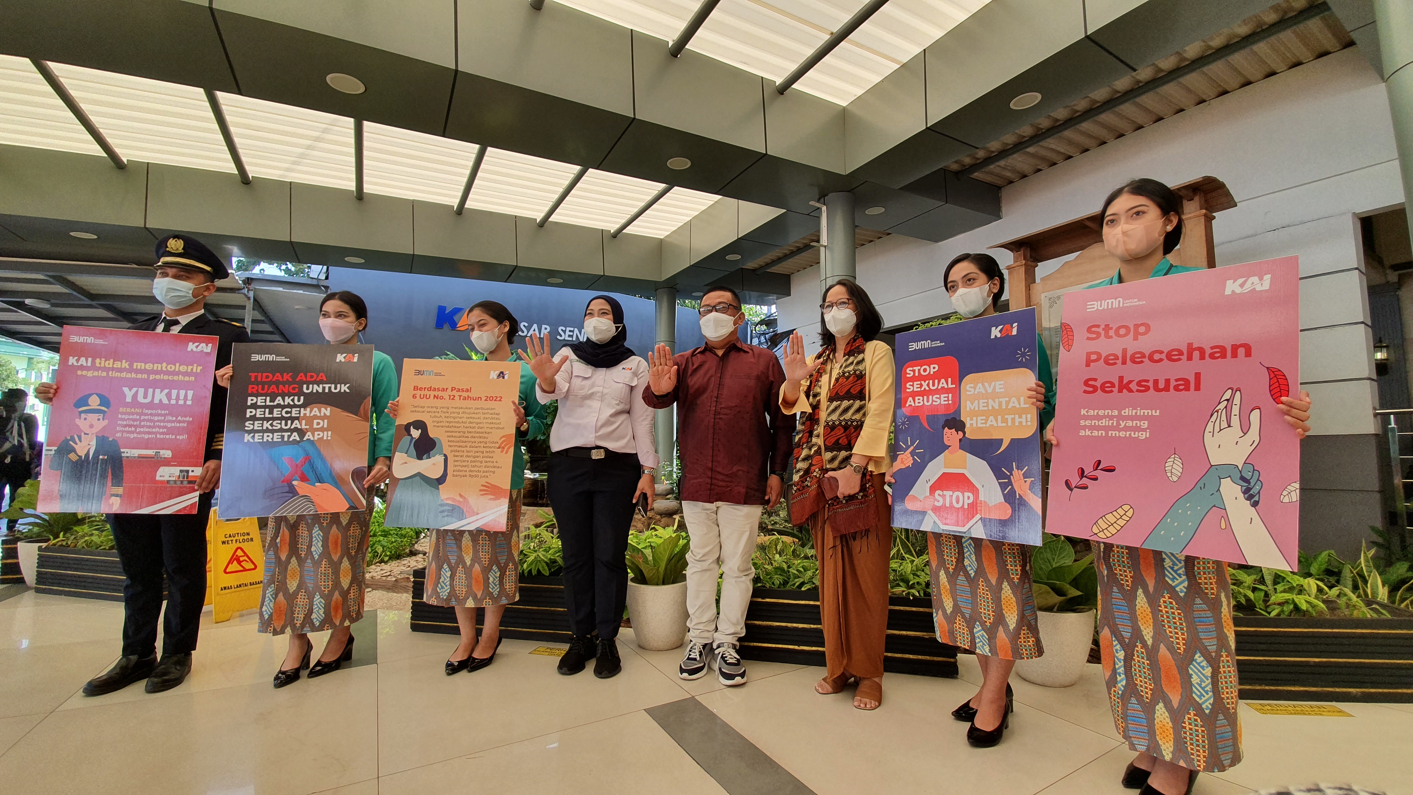 Komnas Perempuan bersama dengan PT Kereta Api Indonesia mengajak penumpang kereta api untuk cegah dan lapor tindak pelecehan seksual di Kereta Api, Rabu, (29/6/2022). Kampanye ini dilakukan di Stasiun Pasar Senen dan Stasiun Tanah Abang Jakarta.