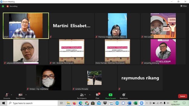 Komnas Perempuanmengadakan media visit ke Majalah Tempo (10/06/2021). Pertemuan yang dilakukanmelalui daring ini merupakan kerjasama dari Subkom Parmas dan Tim Perempuan Pekerja (PP) yang secara fokusmembahas mengenai RUU Perlindungan PRT (RUUPPRT). Pada pertermuan ini, Theresia Iswarini (Komisioner Komnas Perempuan) menyampaikanpemaparannya tentang urgensi RUU Perlindungan PRT termasuk didalamnya hasil pantauan Komnas Perempuandari pemberitaan media mengenai RUU PPRT. Komnas Perempuan diterima olehStefanus Pramono (Redaktur Pelaksana), Syailendra Persada (Redaktur/ Editor)dan beberapa jurnalis Tempo lainnya. Media visit inimerupakan salah satu kegiatanrelasi media sesuai dengan mandatKomnas Perempuan untuk meningkatkan kesadaran publik bahwa hak asasiperempuan adalah hak asasi manusia*)