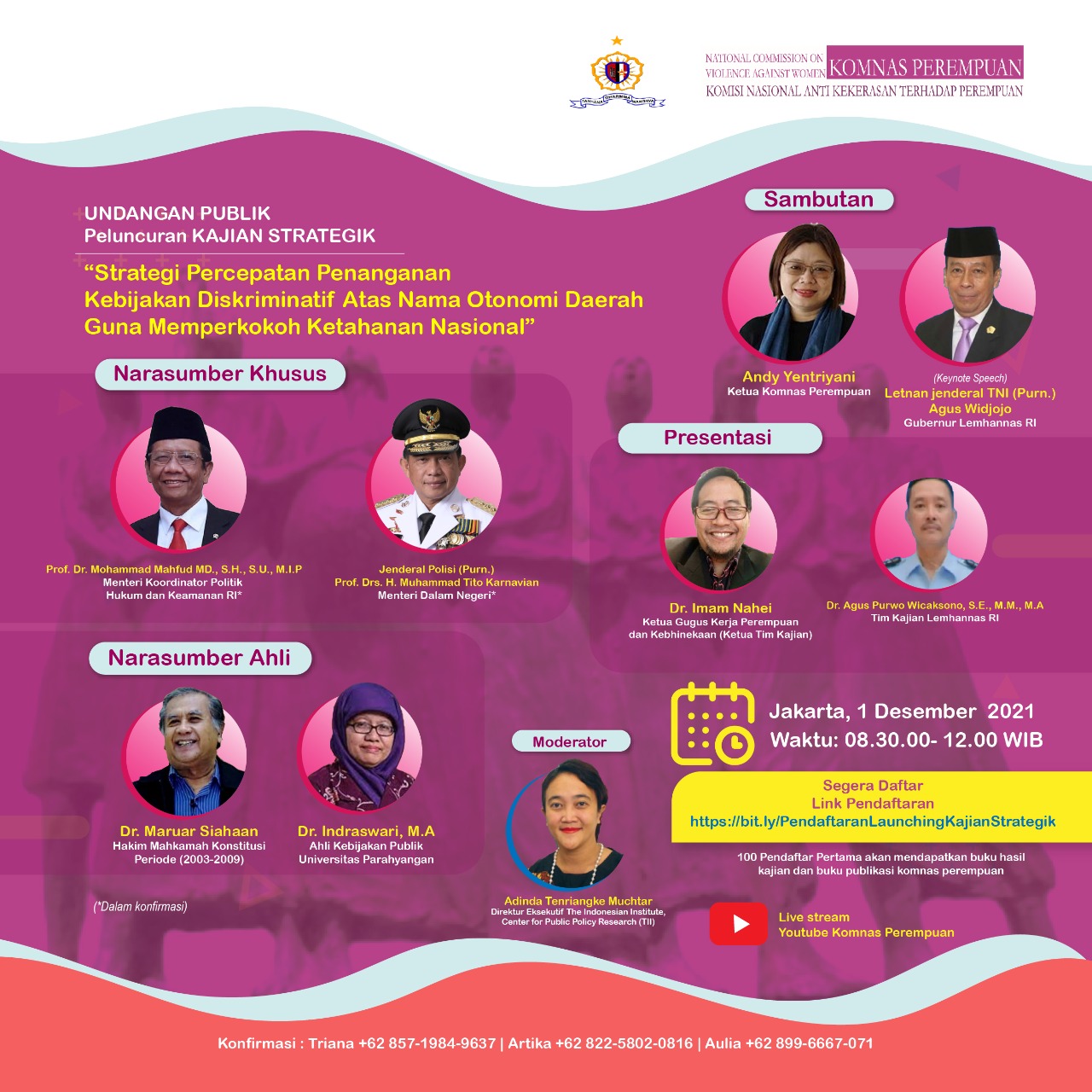 Dalam rangka kerjasama yang dilakukan KomisiNasional Anti Kekerasan Terhadap Perempuan (Komnas Perempuan) dengan LembagaKetahanan Nasional Republik Indonesia mengenai Kajian Strategik: “StrategiPercepatan Penanganan Kebijakan Diskriminatif Atas Nama Otonomi Daerah GunaMemperkokoh Ketahanan Nasional” yang telah dilaksanakan sejak tahun 2020.Kami bermaksud mengundang Ibu/Bapak atau yang mewakili untuk hadir padapeluncuran kajian, yang akan dilaksanakan pada:
